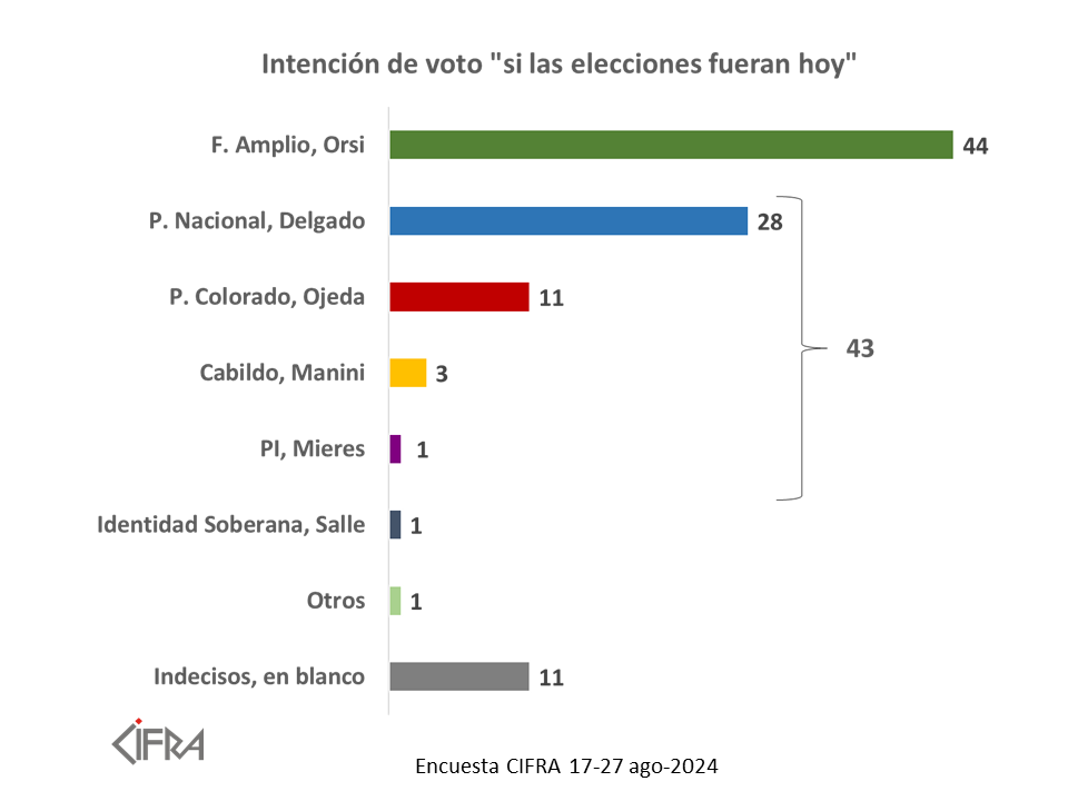 Dentro del 43% para la coalición oficialista, 28% corresponde al Partido Nacional (con Álvaro Delgado como candidato), 11% al Partido Colorado (con Andrés Ojeda como candidato), 3% a Cabildo Abierto (con Guido Manini Ríos como candidato) y 1% al Partido Independiente (con Pablo Mieres como candidato).